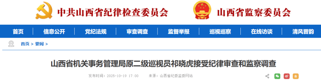 山西省纪委监委网站10月19日消息,山西省机关事务管理局原二级巡视员祁晓虎涉嫌严重违纪违法,目前正接受省纪委监委纪律审查和监察调查。