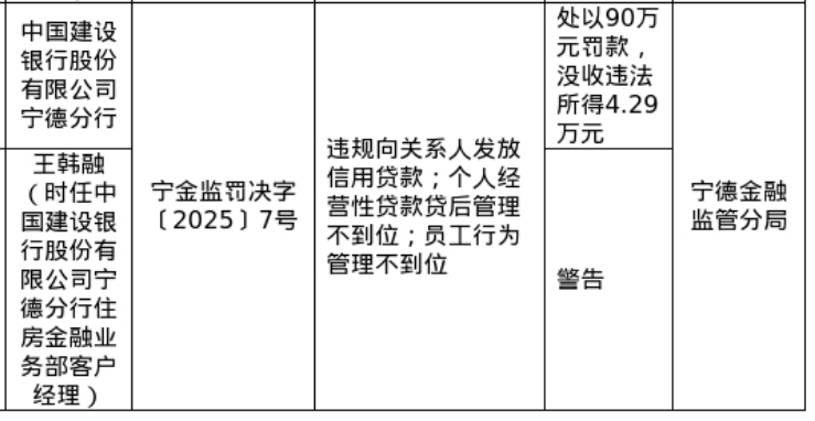 罚单显示,中国建设银行股份有限公司宁德分行的主要违法违规事实(案由)为:违规向关系人发放信用贷款;个人经营性贷款贷后管理不到位;员工行为管理不到位。