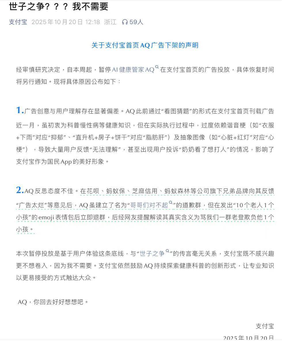 支付宝表示,本次暂停投放是基于用户体验这条底线,与“世子之争”的传言毫无关系,支付宝既不感兴趣更不想卷入,因为不需要。支付宝依然鼓励AQ持续探索健康科普的创新形式,让专业知识以更易接受的方式触达大众。
