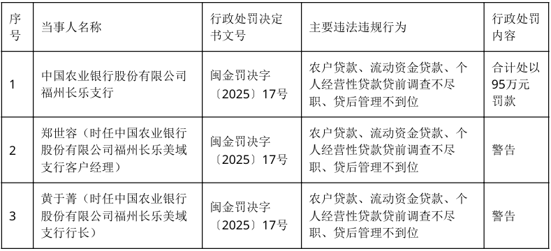 根据福建金融监管局在2025年10月21日发布的行政处罚信息,中国农业银行股份有限公司福州长乐支行因农户贷款、流动资金贷款、个人经营性贷款贷前调查不尽职、贷后管理不到位,被处以合计95万元罚款。