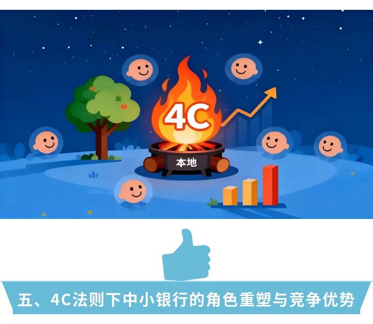 这套转型框架,恰与 “炉要小,火要旺” 的经营智慧高度契合 —— 对中小银行而言,“炉小” 是清醒的定位选择,意味着摒弃 “大而全” 的幻想,聚焦本地、锁定细分圈层,不与大型银行拼规模、抢客群,而是把 “区域小炉” 筑得扎实;“火旺” 是精准的发力方向,代表着将有限资源集中于 4C 能力建设,以圈层深耕点燃客户信任,以场景嵌入释放服务温度,以客户共创激活参与热情,以数据复利放大服务价值,让 “小炉” 迸发持久动能。