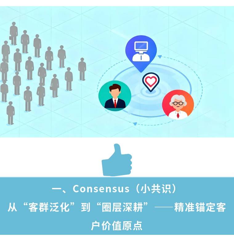 “小共识”的核心逻辑是摒弃“大而全”的客群划分思路,聚焦具备共同特征、一致需求与情感共鸣的“小众圈层”,通过定制化金融解决方案建立深度信任关系。