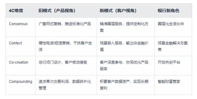 4C法则并非孤立模块,而是相互关联的有机整体:“小共识” 是基础(锁定精准客群),“微场景” 是载体(实现服务渗透),“强共创” 是手段(提升客户粘性),“长复利” 是目标(实现长期价值)。