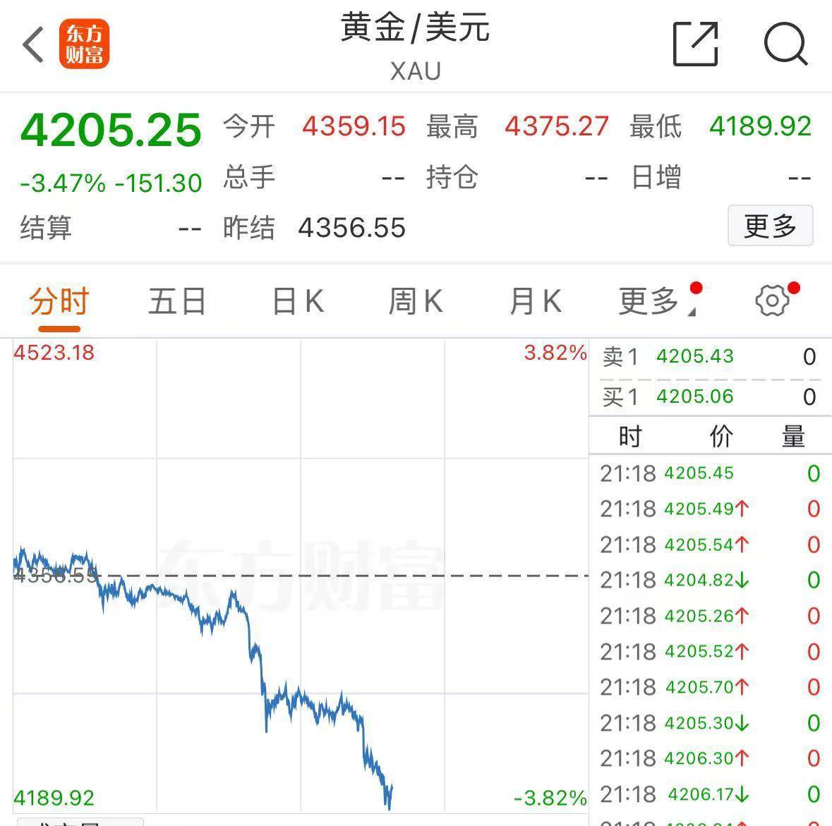 现货黄金向下跌破4200美元,一度下跌3.8%,创四年来最大跌幅。