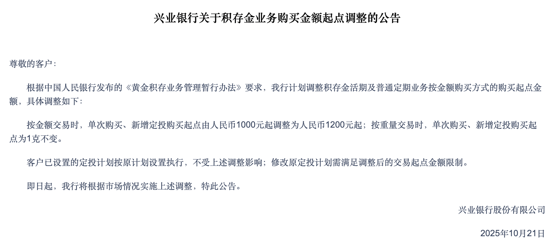 近日,兴业银行公告称,根据中国人民银行发布的《黄金积存业务管理暂行办法》要求,该行计划自10月21日起调整积存金活期及普通定期业务按金额购买方式的购买起点金额。