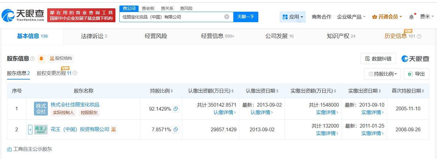 每经AI快讯,天眼查App显示,近日,佳丽宝化妆品(中国)有限公司发生工商变更,注册资本由168亿日元减至38亿日元,降幅约77%。佳丽宝化妆品(中国)有限公司成立于2005年11月,法定代表人为竹安将(TAKEYASUMASARU),经营范围包括互联网销售、佣金代理、美容及相关咨询服务等。股东信息显示,该公司由株式会社佳丽宝化妆品、花王(中国)投资有限公司共同持股。