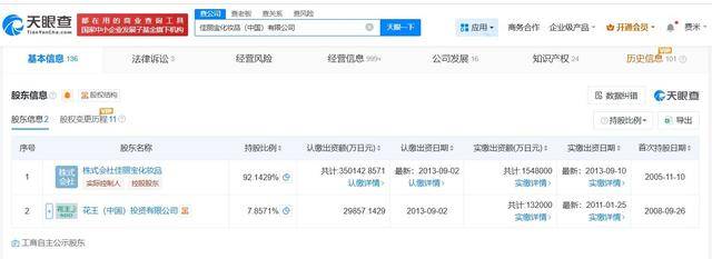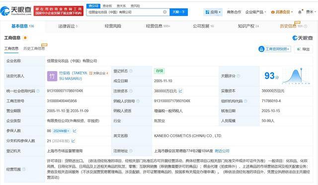 佳丽宝化妆品(中国)有限公司成立于2005年11月,法定代表人为竹安将(TAKEYASU MASARU),经营范围包括互联网销售、佣金代理、美容及相关咨询服务等。股东信息显示,该公司由株式会社佳丽宝化妆品、花王(中国)投资有限公司共同持股。