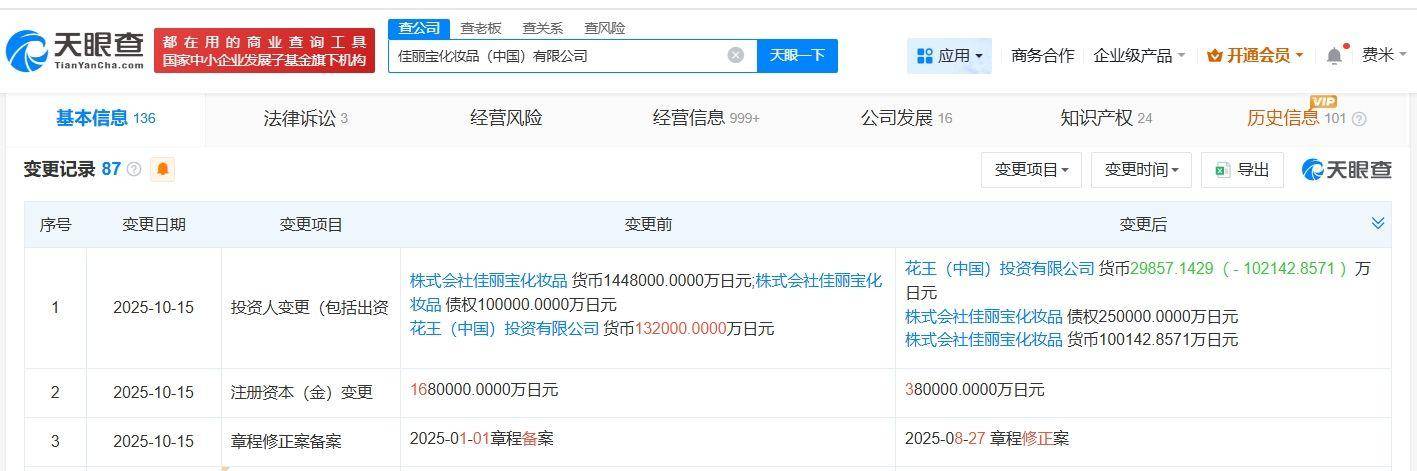 天眼查App显示,近日,佳丽宝化妆品(中国)有限公司发生工商变更,注册资本由168亿日元减至38亿日元,降幅约77%。