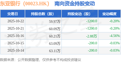 证券之星消息,10月22日南向资金减持1200.0股东亚银行(00023.HK)。近5个交易日中,获南向资金减持的有5天,累计净减持3.16万股。近20个交易日中,获南向资金减持的有20天,累计净减持10.32万股。截至目前,南向资金持有东亚银行(00023.HK)59.97万股,占公司已发行普通股的0.01%。