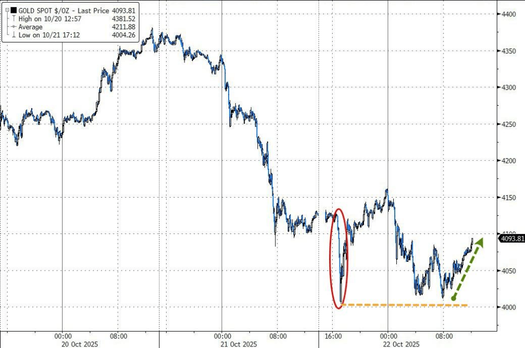 高盛进一步强调由于大型机构投资者配置需求的苏醒,4900美元/盎司的目标价甚至存在“上行风险”。周三现货黄金一度跌至4000美元关口上方,但随后受支撑反弹。