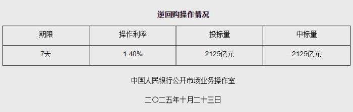 中新网10月23日电 据央行网站消息,2025年10月23日中国人民银行以固定利率、数量招标方式开展了2125亿元7天期逆回购操作。具体情况如下: