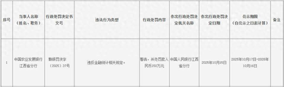 10月20日消息,中国人民银行江西省分行披露的行政处罚信息显示,因违反金融统计相关规定,中国农业发展银行江西省分行被警告,并处罚款150万元。