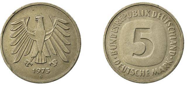 随后德国财政部与央行在1975年决定发行新版5马克硬币,并改用镍铜合金。