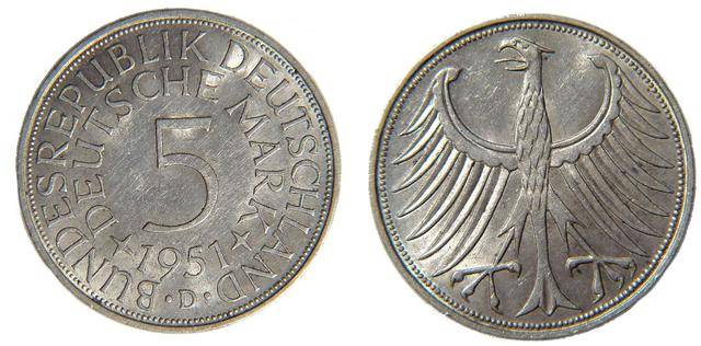 从1951年开始,西德开始铸造面值为5马克的硬币,成分为62.5%银+37.5%铜。由于手感沉、色泽亮,这枚硬币也被视为战后德国经济奇迹的象征。