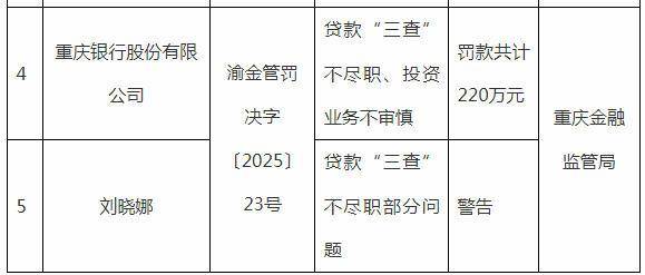 国家金融监督管理总局重庆监管局10月22日披露行政处罚信息公开表,因贷款“三查”不尽职、投资业务不审慎,重庆银行股份有限公司被罚款共计220万元。