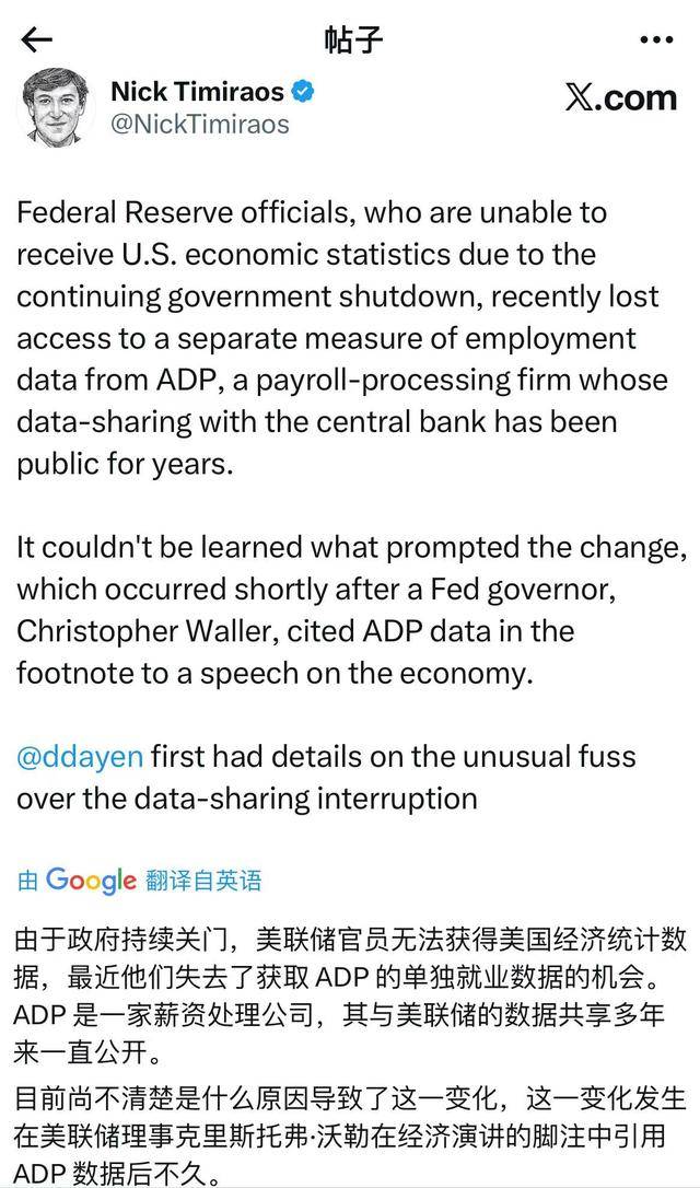 10月23日,有“美联储传声筒”之称的知名财经记者 Nick Timiraos 在社交平台“X”上撰文称,据知情人士透露,由于政府持续“关门”,美联储官员无法获得美国经济统计数据,最近又失去了获取 ADP 就业报告这一数据来源。
