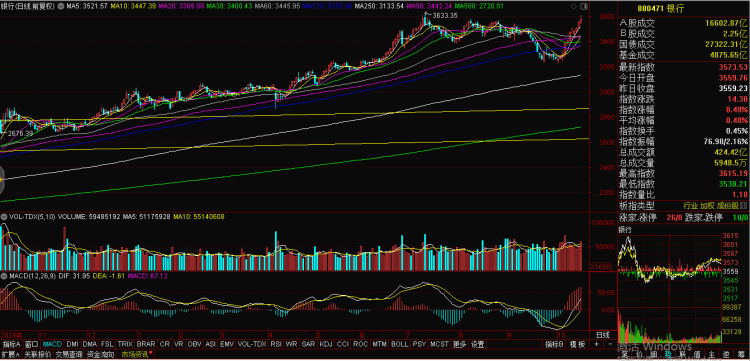 通达信数据显示,当天银行指数高开,随即快速上冲,至9点54分最大涨幅高达1.57%。此后变脸跳水翻绿,至10点36分最大跌幅0.59%。接着逐步攀升,一直到收盘,最终将涨幅定格在0.40%。