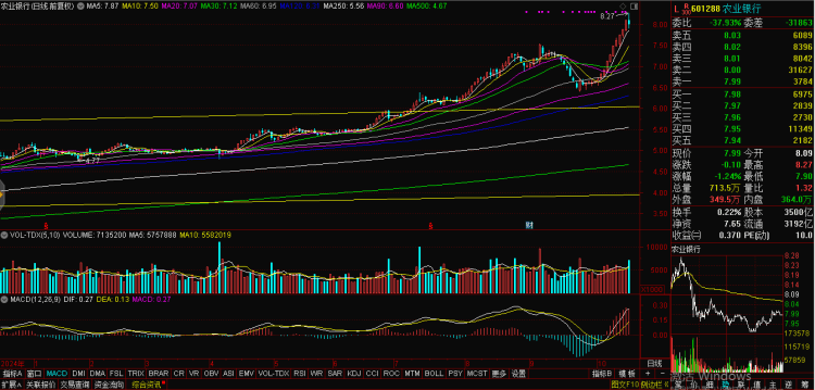 值得一提的是,银行指数最近11个交易日全部收涨。盘面看,42家银行股中有26家收红,邮储银行以4.71%的涨幅领跑银行板块,市净率最低的民生银行大涨2.72%。此前连续14根阳线创出史上最佳战绩的农业银行,盘中高见8.27元。招商银行也成功收复了42.10元每股净资产价位。