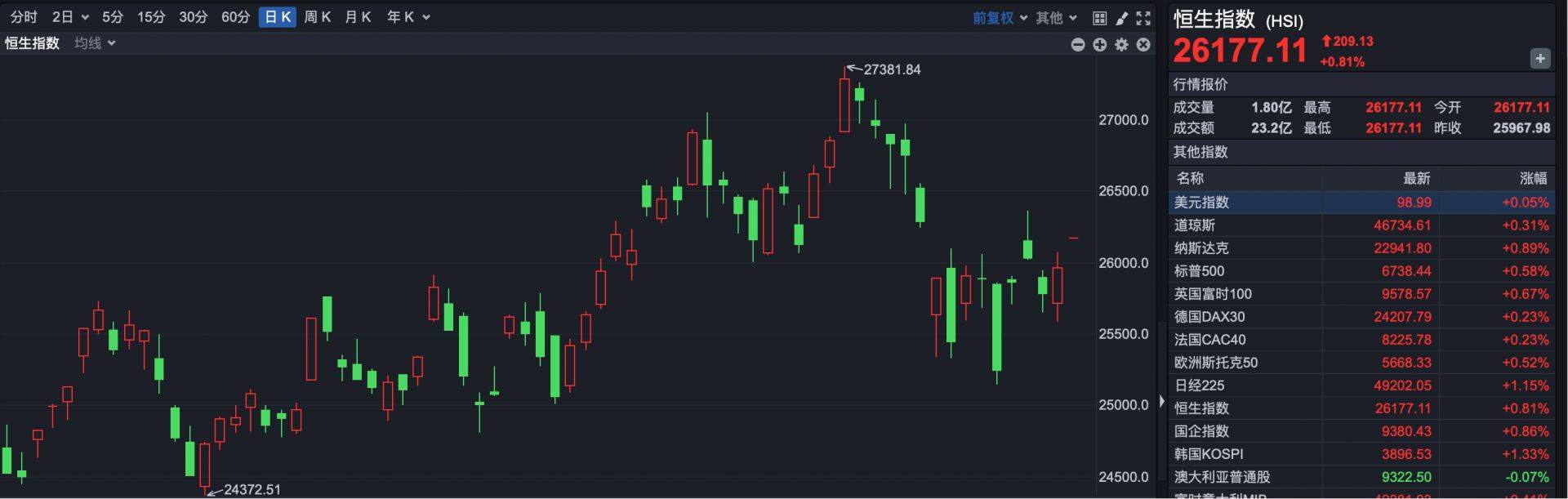 截至发稿,恒生指数报26177点,上涨209点,涨幅0.81%。