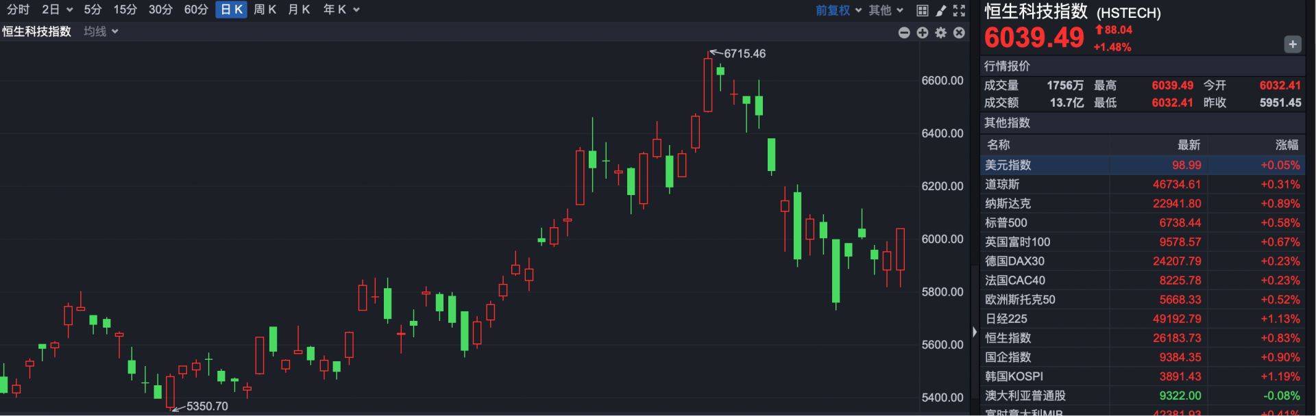恒生科技指数报6032点,上涨81点,涨幅1.36%。