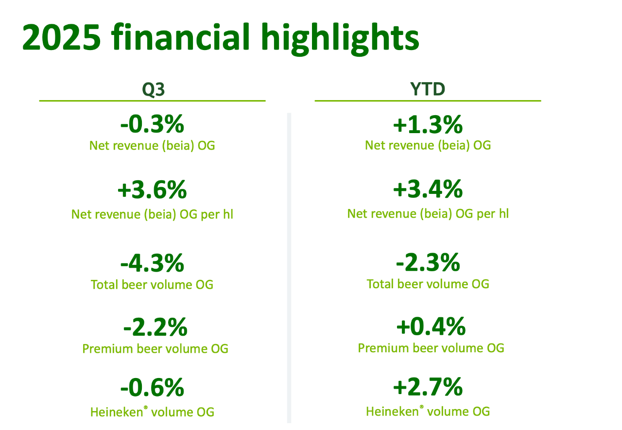 业绩数据显示,2025年前三季度,喜力实现收入256.36亿欧元,同比下降4.7%;前三季度累计销量1754万千升,同比下降2.61%。其中,核心品牌“喜力”销量457万千升,同比增长2.70%,表现优于整体。