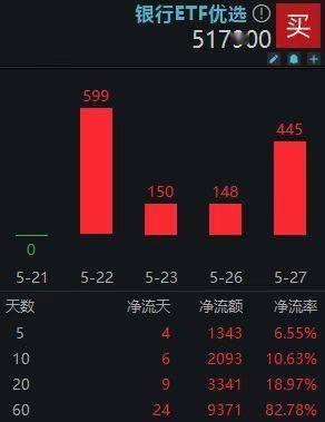 近期银行势头不减,板块吸引效应明显。数据显示,5月27日,银行ETF优选(517900)单日成交1757万元,成交环比前一日放量59.07%!获资金连续4日净流入,年内份额扩容80.49%,创历史新高。