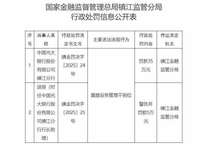中国经济网北京10月26日讯 国家金融监督管理总局镇江监管分局近日公布的行政处罚信息公开表(镇金罚决字〔2025〕24号、25号)显示,中国光大银行股份有限公司镇江分行票据业务管理不到位,被罚款35万元。谈俊(时任中国光大银行股份有限公司镇江分行行长助理)被警告并罚款5万元。