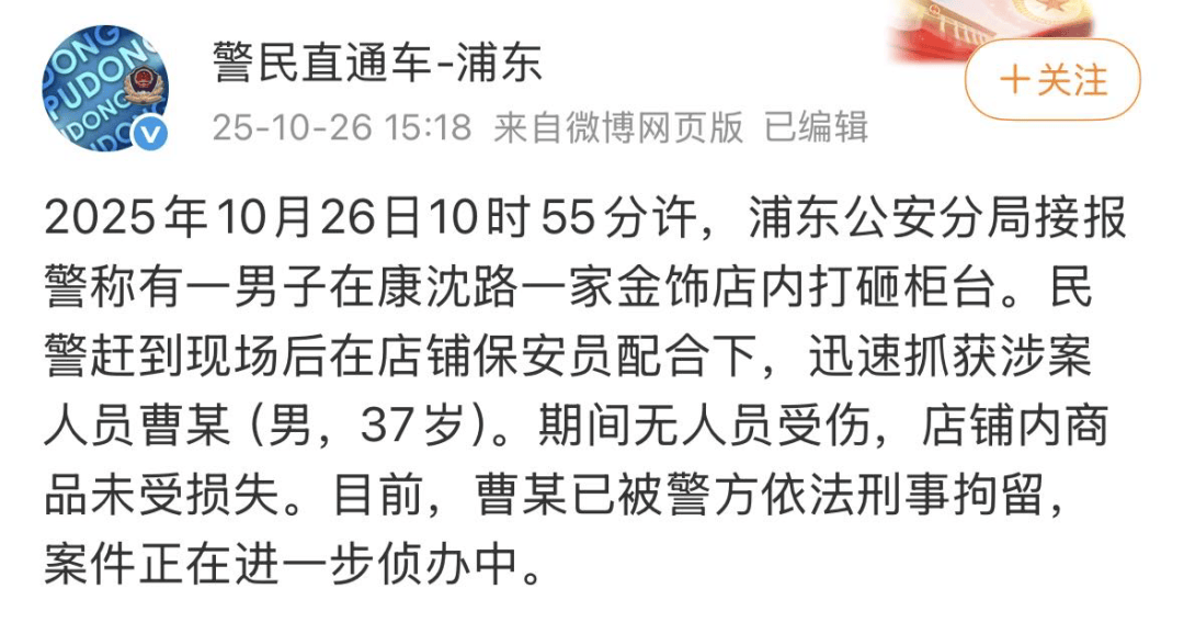 2025年10月26日10时55分许,浦东公安分局接报警称有一男子在康沈路一家金饰店内打砸柜台。民警赶到现场后在店铺保安员配合下,迅速抓获涉案人员曹某(男,37岁)。期间无人员受伤,店铺内商品未受损失。目前,曹某已被警方依法刑事拘留,案件正在进一步侦办中。