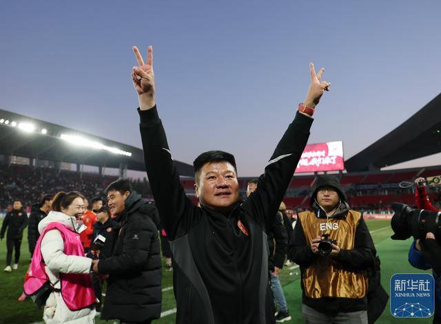 ↑ 辽宁铁人队主教练李金羽(中)在赛后庆祝。新华社记者 李钢 摄