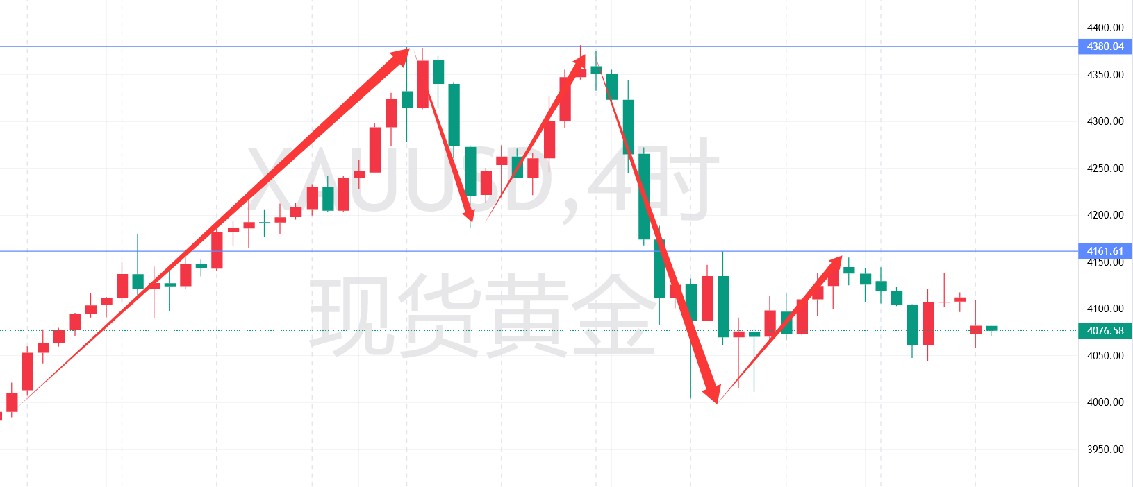 消息面分析:今年以来,金价累计上涨55%,很大程度上得益于贸易紧张局势的刺激,如今局势转向乐观,投资者获利了结的冲动进一步放大,金价从上周一的纪录高位4381.21美元回落超过6%,显示出市场对贸易和解的敏感反应。不过,这一缓和并非一帆风顺,11月1日美国对中国进口商品额外关税的最后期限临近,仍可能带来不确定性,如果谈判出现反复,黄金的避险光芒或将重新闪耀。