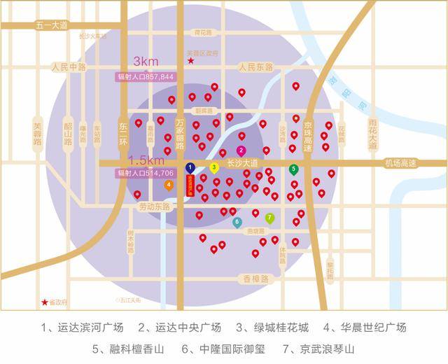 长沙瑞吉酒店、长沙W酒店、华晨豪生大酒店、华雅国际大酒店、地铁5号线等往来客流。