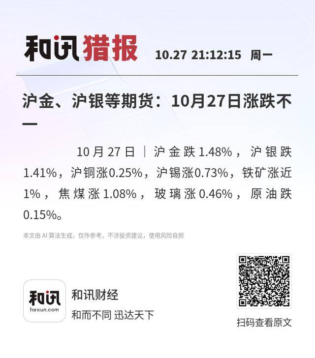 10月27日|沪金跌1.48%,沪银跌1.41%,沪铜涨0.25%,沪锡涨0.73%,铁矿涨近1%,焦煤涨1.08%,玻璃涨0.46%,原油跌0.15%。