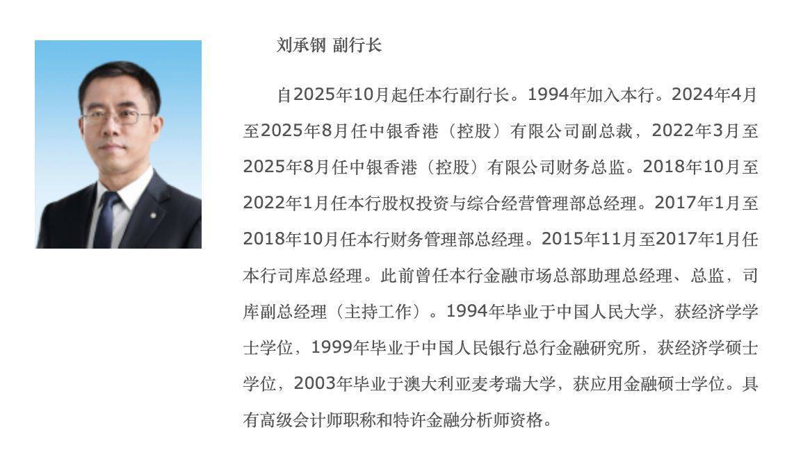 10月27日,中国银行(601988.SH)公告称,2025年8月29日,董事会批准聘任刘承钢为副行长。2025年10月24日起,刘承钢就任副行长。