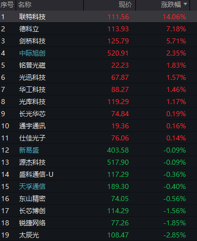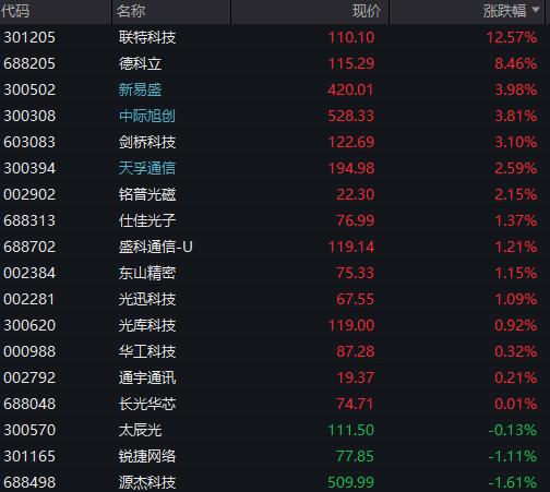 CPO概念震荡回升,中际旭创涨近4%,续创历史新高,联特科技涨超10%,腾景科技、剑桥科技、德科立、光迅科技等跟涨。