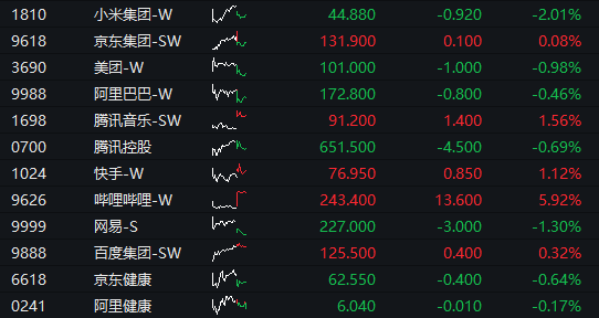 大型科网股分化,哔哩哔哩逆势大涨近6%,快手、腾讯音乐涨超1%,百度、京东小幅上涨,阿里、腾讯控股等微跌,尤小米跌2%。