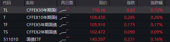 债市:国债期货全线反弹,截至发稿,30年期主力合约涨0.72%,10年期主力合约涨0.26%,5年期主力合约涨0.17%,2年期主力合约涨0.09%。