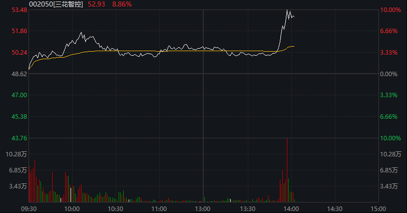 三花智控A股午后拉升触及涨停,股价创历史新高;三花智控港股涨超8%。