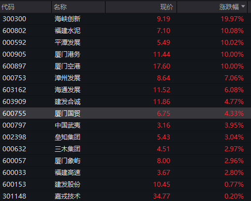 福建海西板块再掀涨停潮,海峡创新两连20%涨停,平潭发展8天6板,福建水泥、厦门港务、厦门空港集体封板,漳州发展、中国武夷冲击涨停。