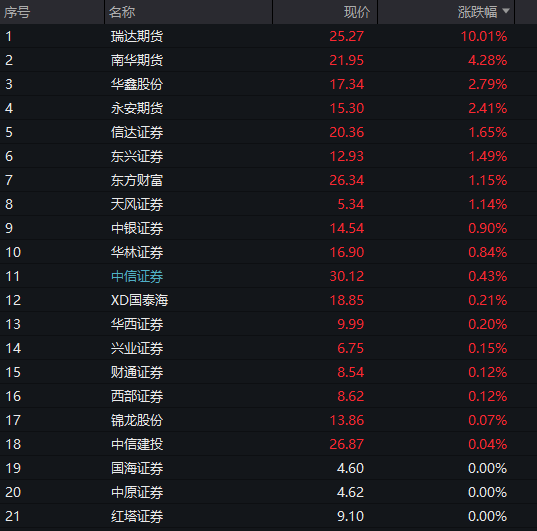临近午盘,大金融板块异动拉升,多元金融、互联金融方向领涨,瑞达期货直线涨停,天利科技涨超10%,汇金股份、南华期货、同花顺、华鑫股份、东兴证券等冲高。