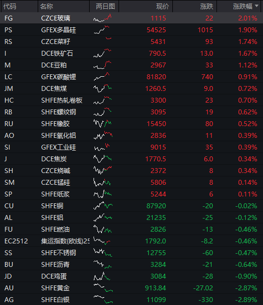 商品:国内商品期货普涨,截至发稿,玻璃涨2%,多晶硅、菜籽、铁矿石、豆粕涨超1%,碳酸锂、焦煤、热卷板、螺纹钢、橡胶、氧化铝、工业硅、焦炭、烧碱、锰硅、纸浆等走高,沪铜、沪铝、燃油、集运指数、不锈钢、沥青、鸡蛋等下跌,受到国际黄金隔夜跌破4000美元关口,白银大跌5%影响,沪金、沪银均跌超2%。