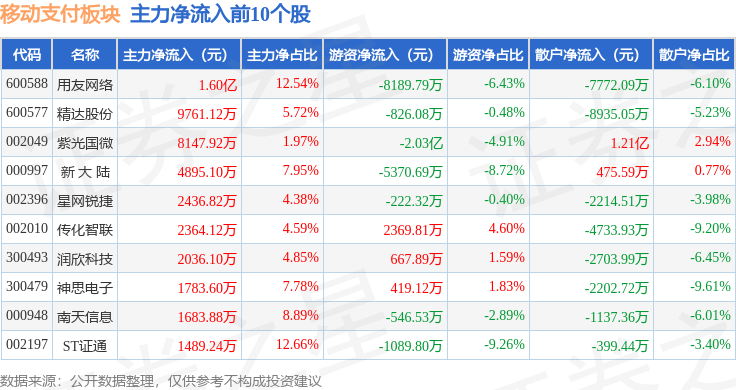 从资金流向上来看,当日移动支付板块主力资金净流出12.61亿元,游资资金净流入4569.81万元,散户资金净流入12.15亿元。移动支付板块个股资金流向见下表: