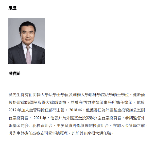 10月28日,香港金融管理局宣布,财政司司长根据外汇基金咨询委员会辖下管治委员会建议,批准委任吴祥趾为外汇基金投资办公室副行政总裁,相等于助理总裁级别。委任于2025年11月1日生效。作为外汇基金投资办公室副行政总裁,吴祥趾将负责外汇基金的整体投资管理,并向外汇基金投资办公室行政总裁报告。