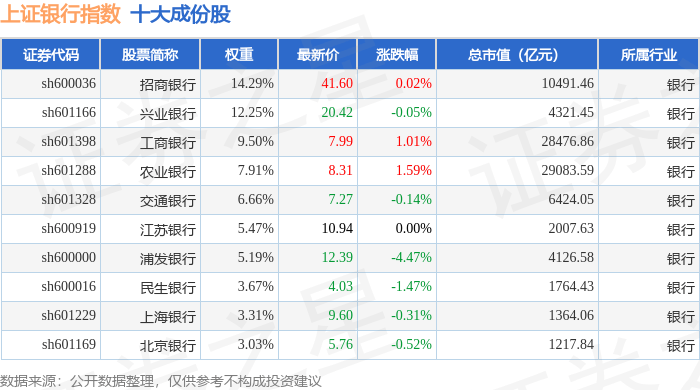 证券之星消息,10月28日,上证银行(000134)指数报收于1053.14点,跌0.16%,成交288.51亿元,换手率0.3%。当日该指数成份股中,上涨的有7家,农业银行以1.59%的涨幅领涨,下跌的有16家,浦发银行以4.47%的跌幅领跌。