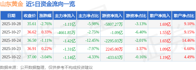 证券之星消息,截至2025年10月28日收盘,山东黄金(600547)报收于35.61元,下跌2.76%,换手率1.43%,成交量51.66万手,成交额18.58亿元。