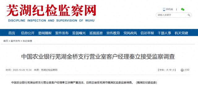 中国农业银行芜湖金桥支行营业室客户经理秦立涉嫌严重违法,目前正接受芜湖市镜湖区监委监察调查。(镜湖区纪委监委)