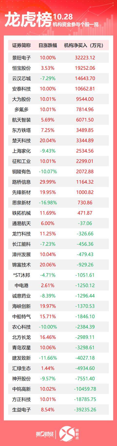 10月28日龙虎榜中,共35只个股出现了机构的身影,有16只股票呈现机构净买入,19只股票呈现机构净卖出。当天机构净买入前三的股票分别是景旺电子、恒宝股份、云汉芯城。当天机构净卖出前三的股票分别是生益电子、方正科技、中钨高新。