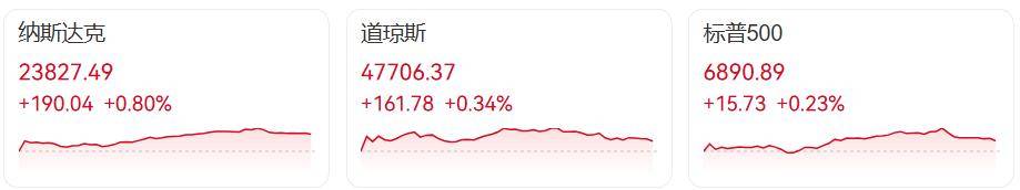 截至收盘,标普500指数上涨0.23%,收于6890.89点,盘中首次突破6900点关口;纳斯达克综合指数上涨0.80%,报23827.49点;道琼斯工业平均指数上涨161.78点,涨幅0.34%,收报47706.37点。