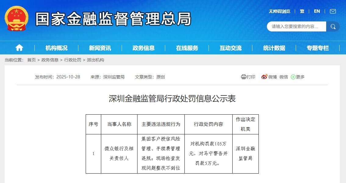 人民网深圳10月29日电 (刘森君)10月28日,深圳金融监管局公示行政处罚信息,微众银行因存在违法违规行为,被处以105万元罚款。