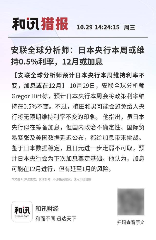 【安联全球分析师预计日本央行本周维持利率不变,加息或在12月】10月29日,安联全球分析师Gregor Hirt称,预计日本央行本周会将政策利率维持在0.5%不变。不过,植田和男可能会避免给人央行将无限期维持利率不变的印象。 他指出,虽日本央行似在筹备加息,但国内政治不确定性、国际贸易紧张及美国数据延迟公布,都给加息带来挑战。 鉴于日本数据稳定,且日元进一步走弱不可取,预计日本央行会为下次加息奠定基础。他认为,加息可能在12月进行,但有延至1月的风险。
