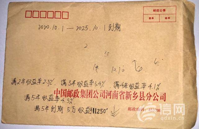 信网/信号新闻10月27日讯“满5年到期5万收益11250。”这是中国邮政储蓄银行新乡县翟坡镇营业所内,一名工作人员在邮储银行的信封上,给一位老人的手写承诺。老人本是想定期存款,“在银行里被忽悠着买了保险。买之前他们反复承诺利息高,能保4.5%的年收益,结果到期连3.2%都不到。”近日,河南新乡市民李女士向信号新闻(热线0532-80889431)反映了她母亲的遭遇。